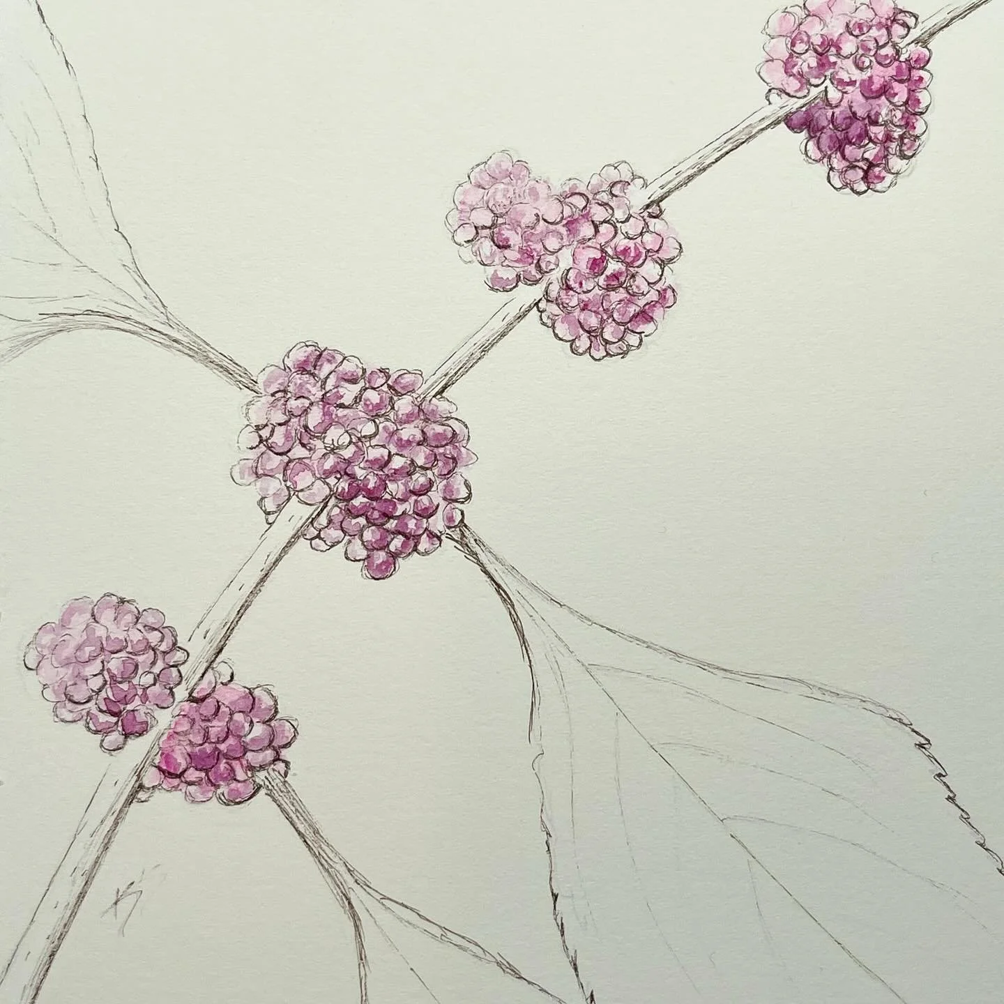View fullsize Pen and watercolor of Louisiana’s native shrub, Callicarpa americana (American Beautyberry). Look at this berries! The berries aren’t really berries at all. They are actually considered drupes (like a cherry) because there is a seed for e