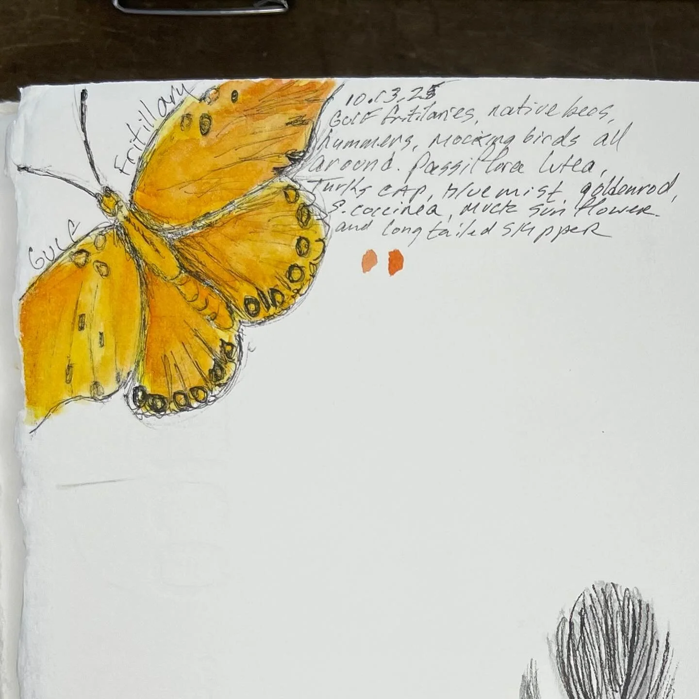 View fullsize Tashi Delek and good morning! This week has been filled with pollinators despite only getting 4 hours of sun in the garden. The fritillaries stood out and so this is what I drew in my PJ. I counted 15 Gulf fritillaries, many native bees, skippers, hu