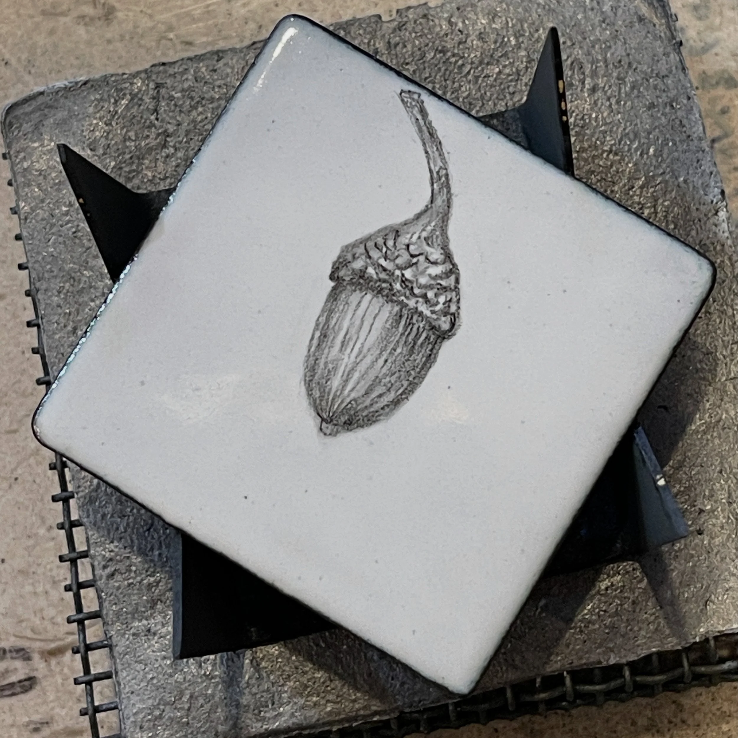 Once that foundation is set, I start building up layers—one color at a time—adding sifted enamel and hand-drawn elements. After each addition, the piece returns to the kiln. This process repeats throughout the day.